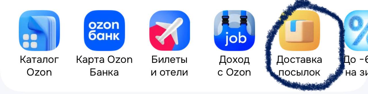 Заходите в приложение OZON на главную страницу, ищите значок "Доставка посылок".