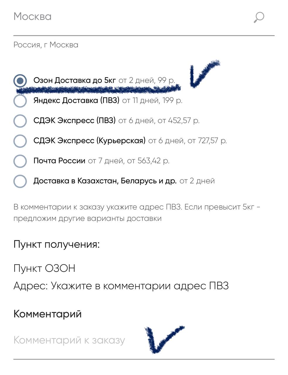 Доставка OZON отображается в корзине при выборе доставки. Не забудьте указать адрес ПВЗ и номер телефона, привязанный к аккаунту OZON, иначе срок отправки увеличится!